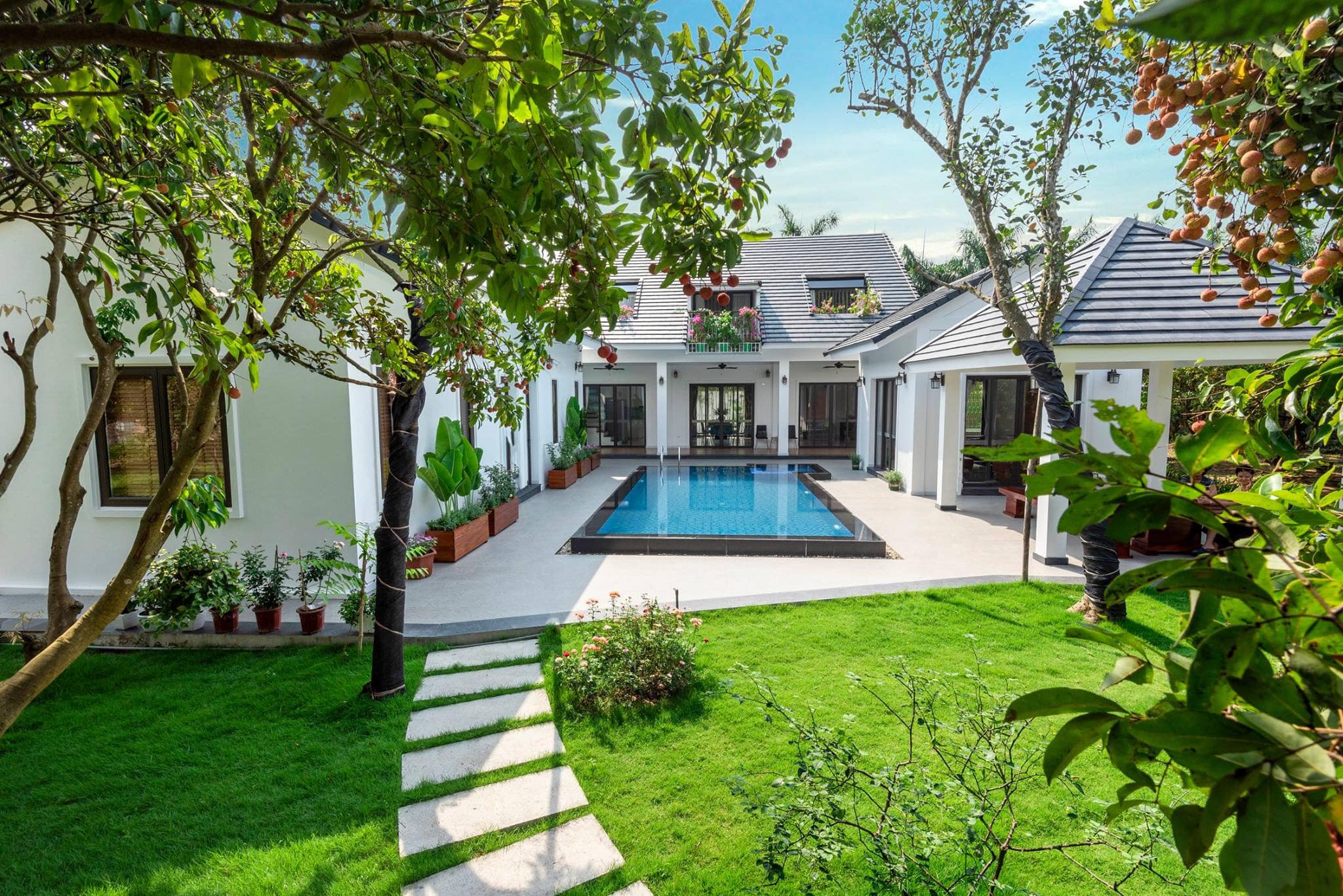 Villa tiêu chuẩn 5 sao, diện tích 400 m2, tổng diện tích nhà vườn 5000 m2. Bao gồm: 04 phòng ngủ (01 giường đôi 1,8m x 2m), 01 phòng ngủ tập thể, 01 phòng khách, 01 mini Bar ngoài trời, 01 phòng sinh hoạt chung, bếp, bể bơi, phòng xông hơi, sân cỏ tổ chức tiệc ngoài trời, teambuilding, lửa trại, BBQ.