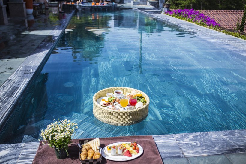 Đến hồ bơi bạn nhớ thưởng thức đồ ăn sáng kiểu “Floating Breakfast”, chiếc thuyền với đầy đủ các món ăn đủ chất, bài trí đẹp được Zen thả nổi để bạn vừa bơi, vừa ăn nổi vừa ngắm một góc chill tại Khe Sanh.