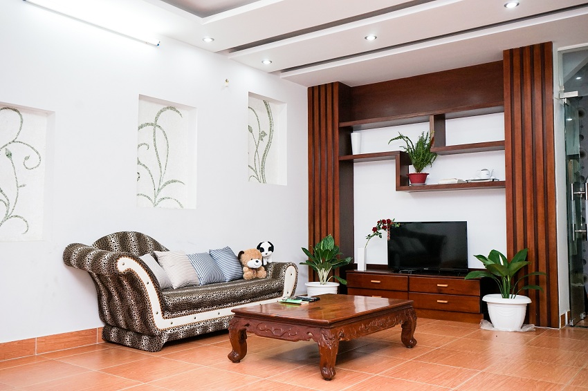Phòng khách tương đối rộng rãi với phần kệ và bàn được làm bằng gỗ mang phong cách cổ điển, trong khi đó phần ghế sopha lại mang những nét hiện đại mang đến những ấn tượng khá mới mẻ cho du khách.
