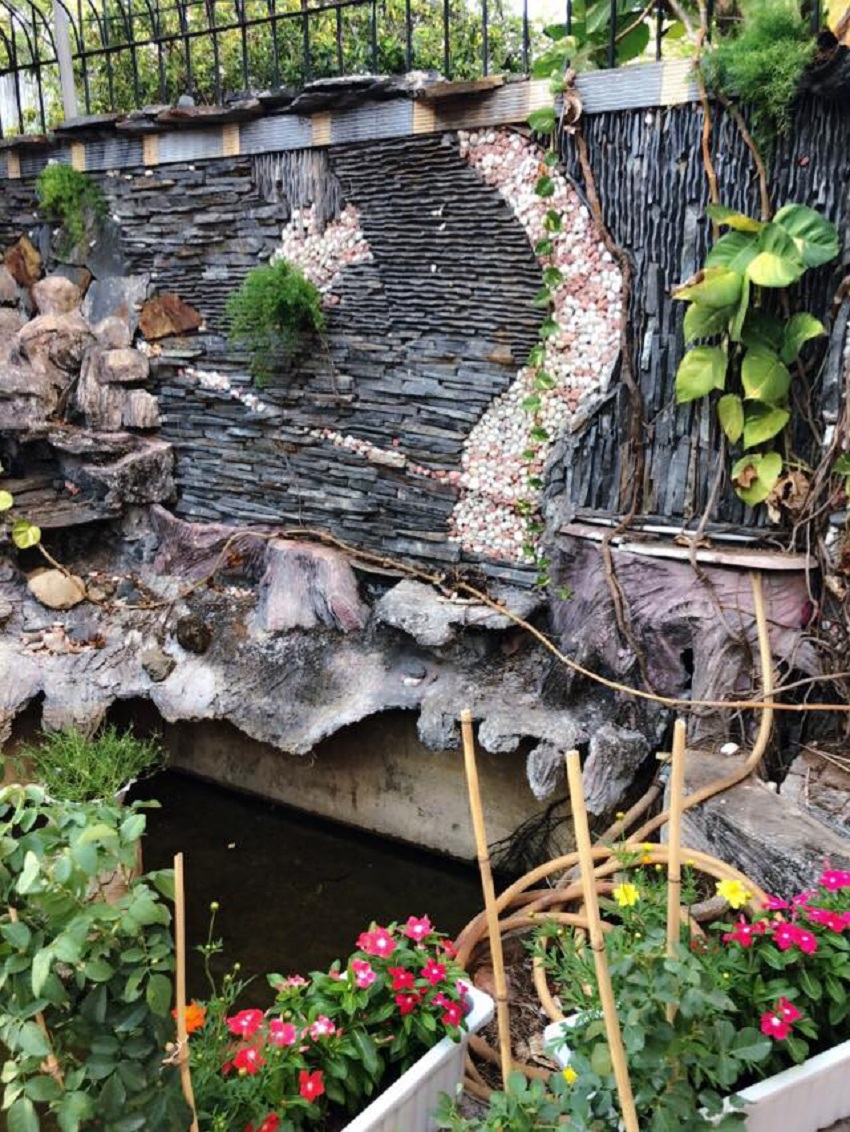 Ngay bên dưới bức tường là một hồ cá nhỏ, xung quanh là những chậu cây cảnh được treo lên cao, tạo ra sự hài hòa đặc biệt cho bức tranh mô phỏng cảnh sơn thủy.