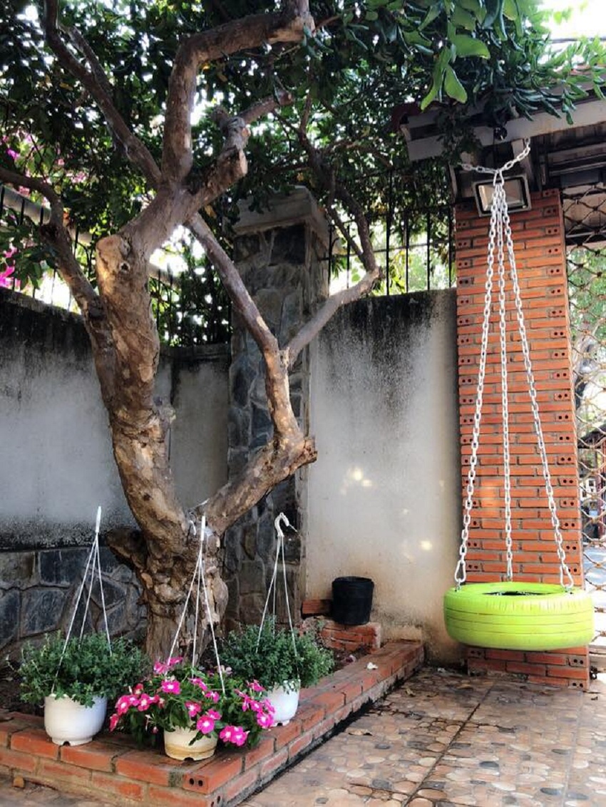 Trong khuôn viên của khu vườn còn có bàn ghế và xích đu được cách điệu từ chính chiếc lốp cao su sơn màu. Đây sẽ là không gian thư giãn, tâm tình tuyệt vời dành cho bạn và những người thân khi lưu trú tại Felice Homestay Vũng Tàu đấy.
