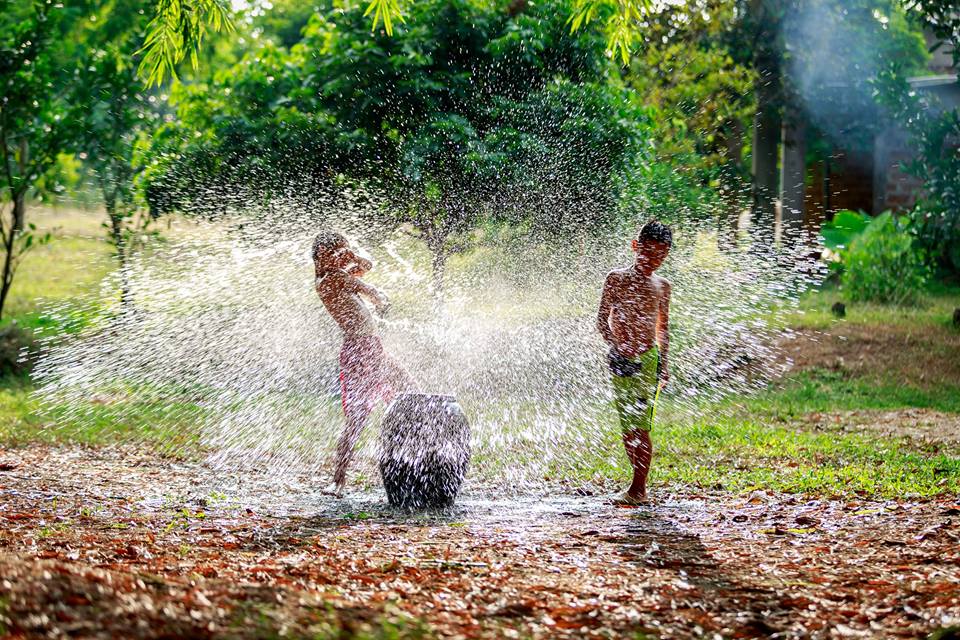 Những em bé hồn nhiên nô đùa học bài, chăn trâu thổi sáo,…