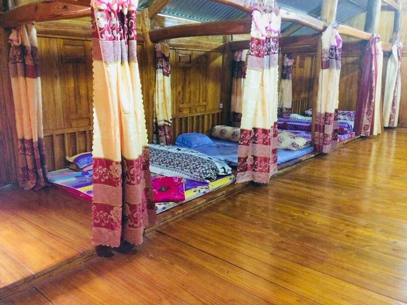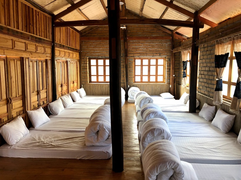 Có nhiều phòng để lựa chọn: Phòng tập thể 50k/người/đêm, phòng 1 giường đôi cho 2 người 150k/phòng/đêm, phòng 2 giường cho 3 người (200k/phòng/đêm).