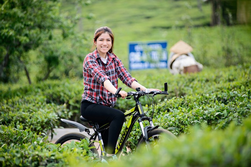 Với xung quanh bốn bề được bao bọc bởi những đồi chè xanh mướt. Hãy thử tưởng tượng vào mỗi buổi sáng sớm, trước mắt bạn là khung trời bao la, tự tay ngắt cho mình những đọt trà non nỏn còn đọng đầy sương trên lá lúc sáng sớm. Và trên chiếc xe đạp rồi tự chính mình khám phá và cảm nhận nét đẹp riêng của Mộc Châu, không hoà lẫn vào đâu được.