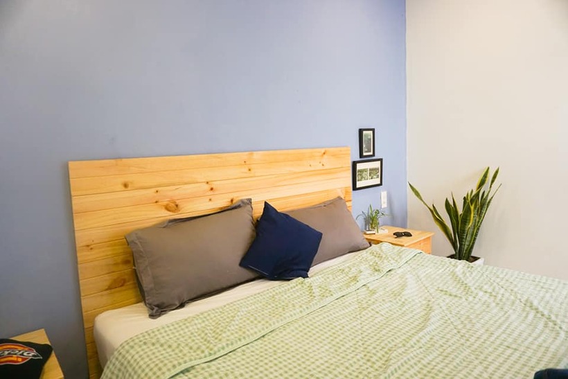 Phòng ngủ của homestay gồm 2 tông màu chủ đạo là xanh dương và màu trắng, lại thêm việc được lát sàn gỗ và kết hợp thêm chùm đèn vàng treo trên trần khiến nơi đây lúc nào cũng ấm áp và nhẹ nhàng đến lạ.