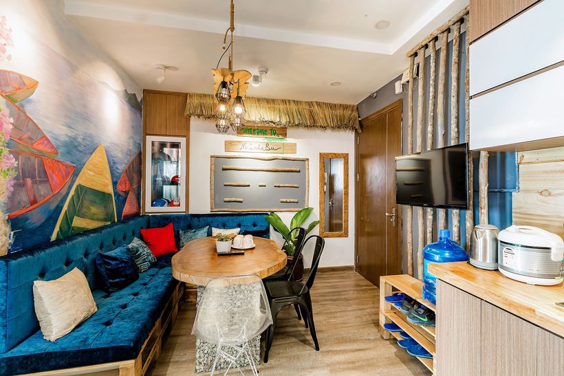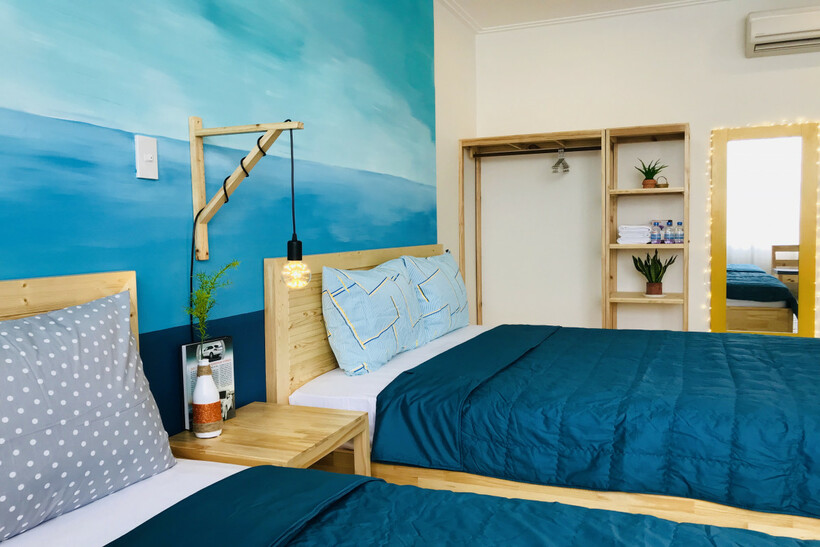 Homestay được thiết kế rất lung linh theo chủ đề biển, với hai tông màu xanh dương và trắng chiếm trọn spotlight. Điểm nhấn của Vitamin Sea có lẽ còn nằm ở hình ảnh mái chèo, con thuyền cũng những đàn cá đang thỏa sức “tung tăng bơi lội” ngay trên những bức tường ở nơi đây.