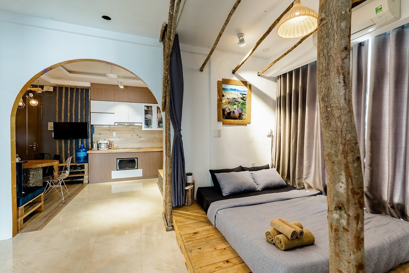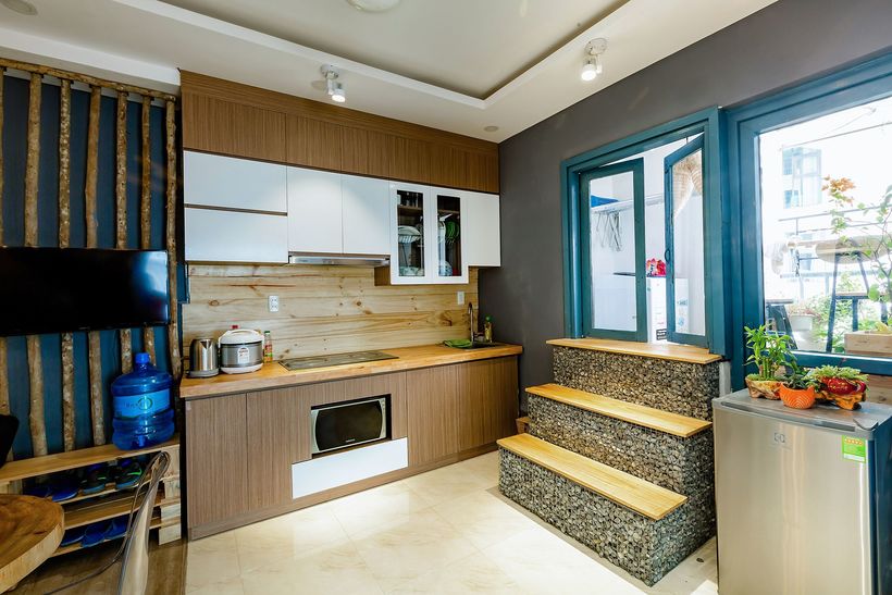 Bất ngờ trước không gian trầm tư mộc mạc mang hơi hướng cổ điển: vách tường sần sùi, sàn gỗ nâu sờn và những mảng tường có nhiều hình họa lạ mắt. Bất ngờ trước thiết kế đa năng siêu thông minh: sàn gỗ có thể nâng lên hạ xuống làm giường ngủ rộng rãi nếu đi đông người. Bất ngờ trước 2 phòng ngủ rộng thoáng đầy đủ tiện nghi và có view ngắm thành phố thoáng mát.