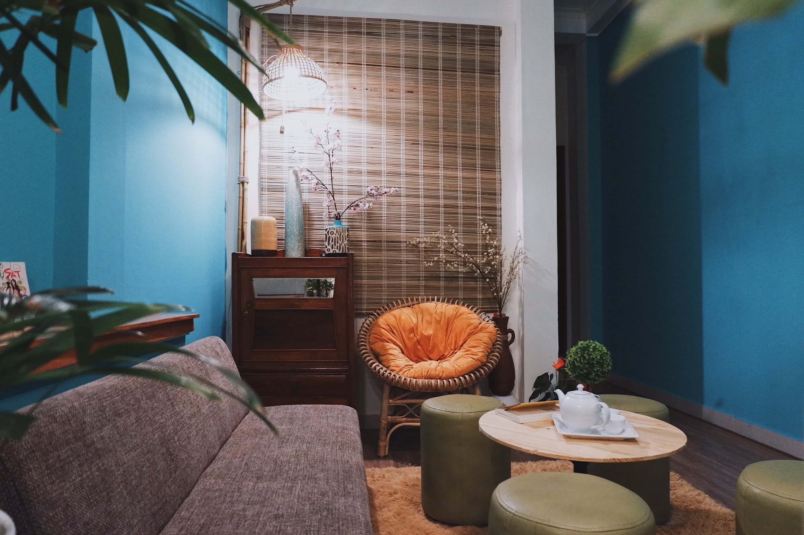 Không gian nhỏ xinh được chị chủ homestay khéo léo lấp đầy với đủ những vật dụng dễ thương, lại điểm xuyết thêm những gam màu sáng như sofa xanh, gối sọc, thảm trải sàn màu đỏ,… khiến căn phòng như trở nên bừng sáng và thu hút đến lạ thường.