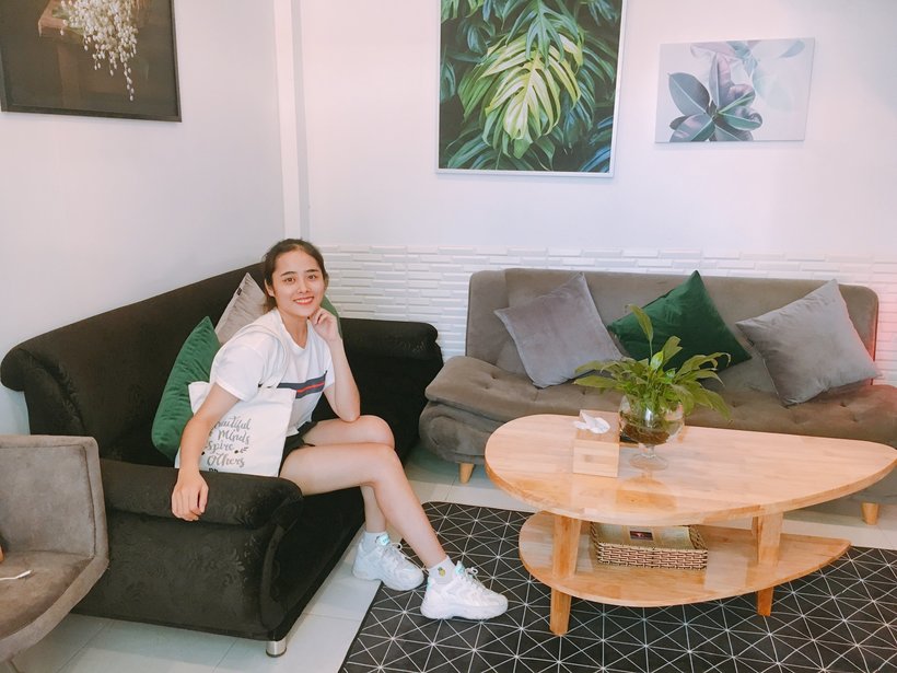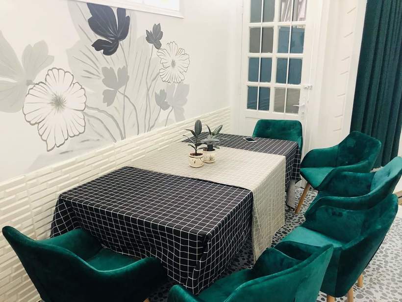 Phải nói là không gian phòng lễ tân mang cái ngọt thanh tao nhẹ nhàng, tươi mát. Sắc xanh tươi tắn của những bức tranh treo tường kết hợp với các chậu cây và gối ôm màu xanh nhung lạ mắt khéo léo thổi hồn cho không gian trở nên quen thuộc, thanh mát vô cùng.