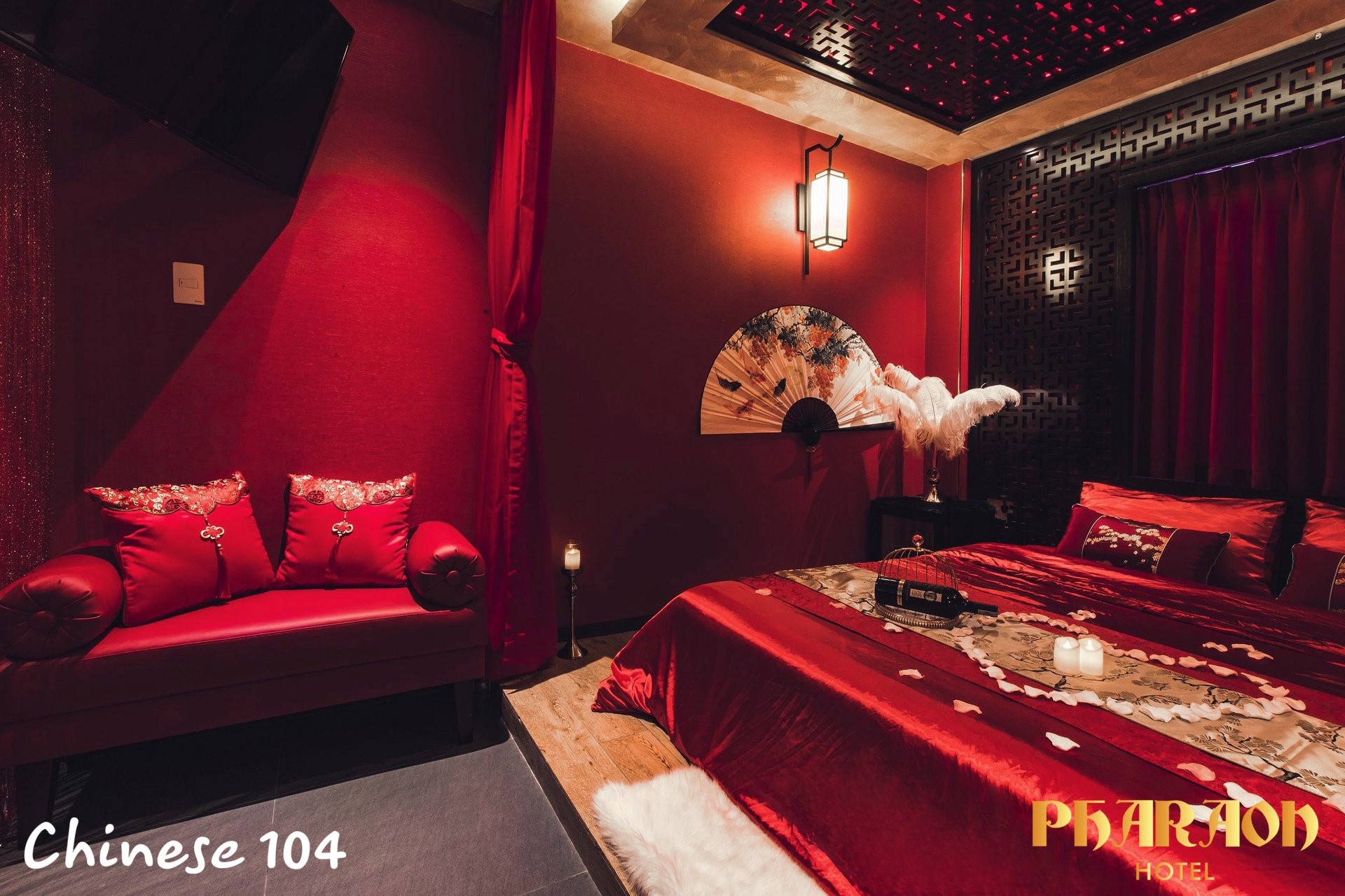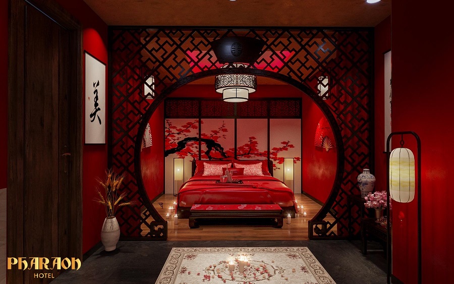 Khách sạn được trang trí bằng tone màu đỏ lãng mạn