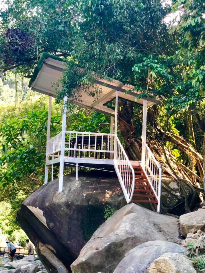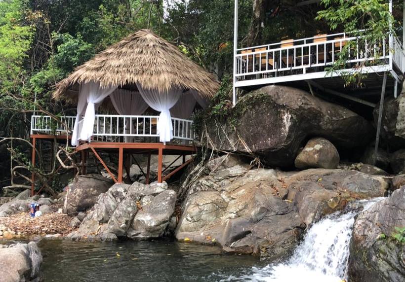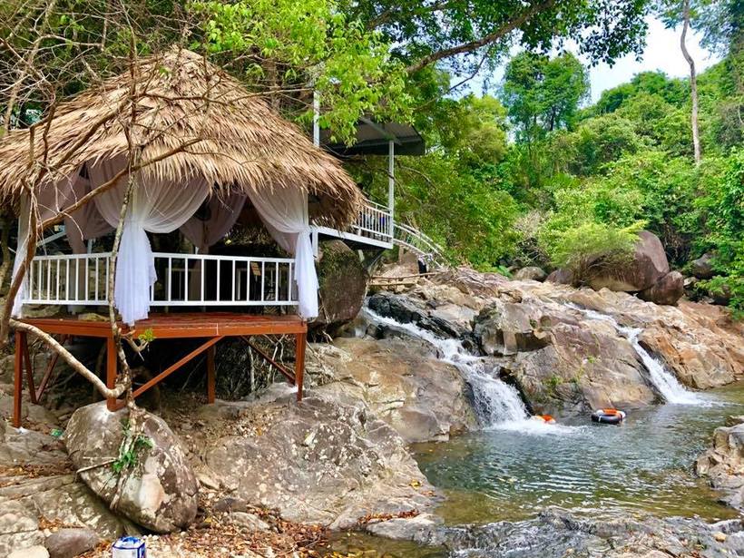 Còn có khu lều lá nghỉ bên cạnh đó là dòng nước trong xanh như màu ngọc bích. Nơi mà dừng chân thôi bạn đã thấy đủ an yên và thanh tịnh rồi.