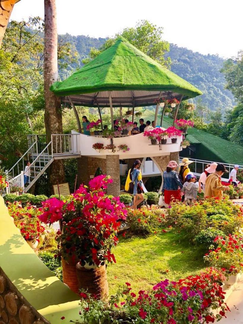 Như có khu nhà mái lá độc đáo, như 1 nơi dừng chân để nghỉ. Xung quanh bạt ngàn là ngàn hoa đang rực rỡ, kế đó là khu cỏ nhân tạo xanh mướt 1 màu. Vì thế du khách cứ đổ xô đến đây.