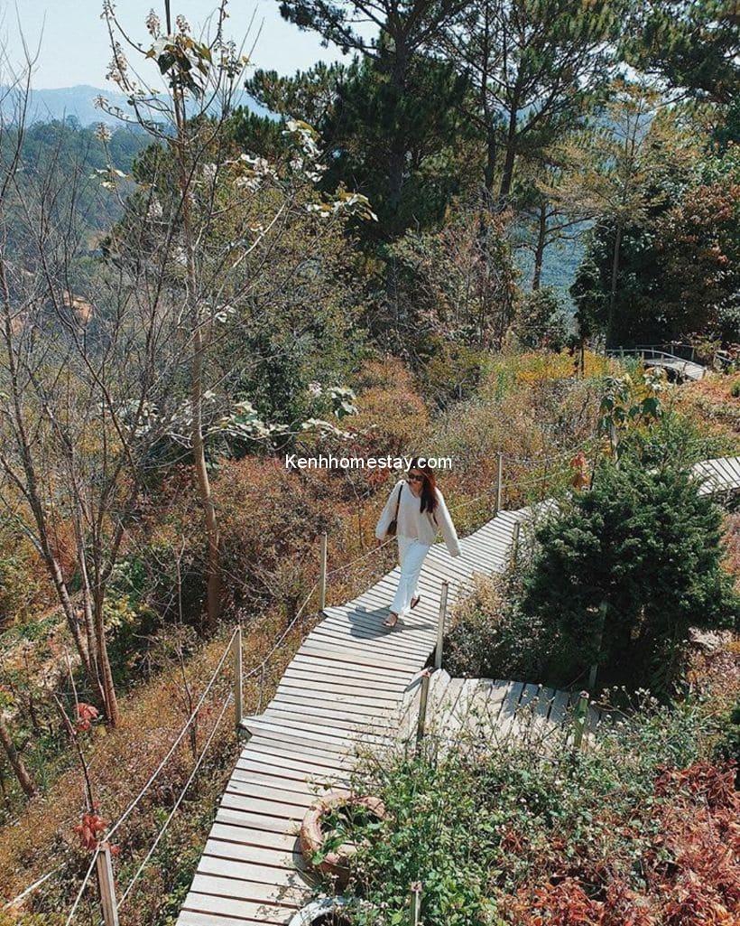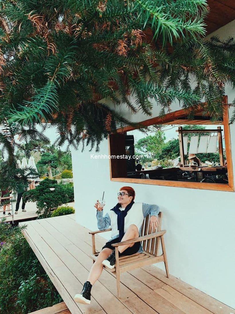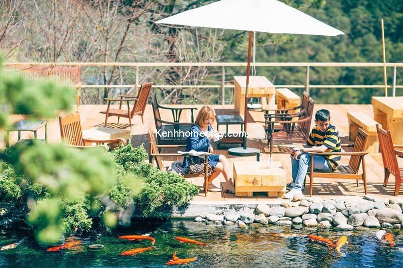 Hồ cá này còn nằm bên canh cây cầu gỗ trải dài đưa chân du khách vào đến khu cafee. Bên cạnh đối diện hồ cá là khuôn viên xanh, nơi rộng mở, thư tháu để du khách có thể thu vào tầm mắt toàn bộ khung cảnh thung lũng rừng thông “đặc sản” của Đà Lạt.