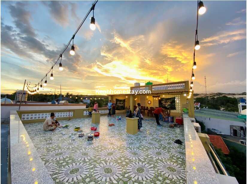Nơi khiến bạn trở thành kẻ suy tình hay tương tư chính là không gian rooftop. Nơi này thoáng rộng, tích hợp với không gian bếp, được lát gạch hoa chống trơn. Vào mỗi tối, sân thượng thêm phần lung linh, đón gió biển dạt dào và cũng là địa điểm mà các bạn trẻ, gia đình yêu thích nhất.