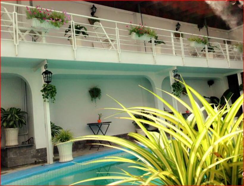 Bên ngoài là hồ bơi nhỏ xinh với nhiều loại ghế ngồi để vừa thư giãn dùng đồ uống vừa ngắm hồ bơi và chụp hình đẹp.