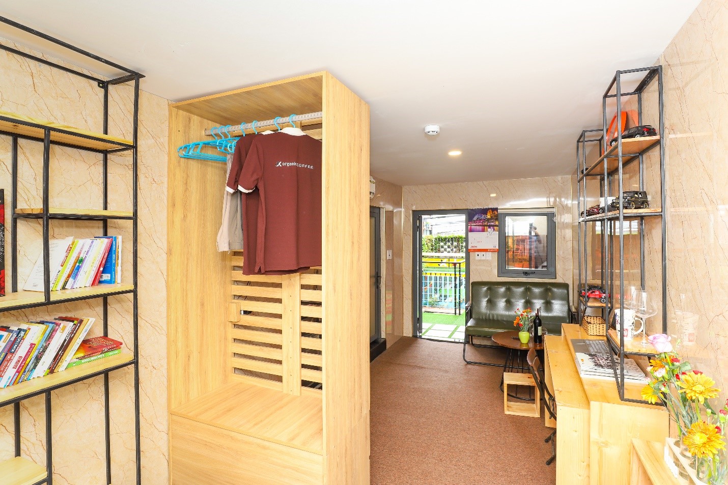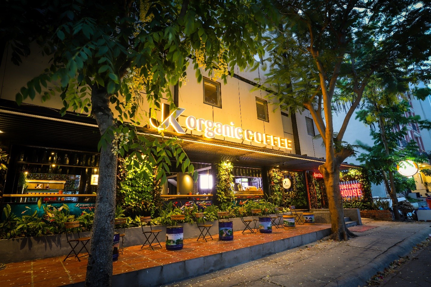 Đến với JK Container House bạn sẽ được tận hưởng không gian thiết kế dạng container 4 tầng sang trọng với 36 congtainer 20”. Nơi đây sở hữu không gian thư viện đọc sách, môi trường lành mạnh có máy lạnh và sức chưa đến 30 bé. Tầng trệt là Coffee Orgarnic rộng 350m2 cùng bể cá Koi độc đáo. Tại đây bạn có thể thuê phòng máy lạnh phục vụ hội thảo, tổ chức sự kiện trong phòng máy lạnh.