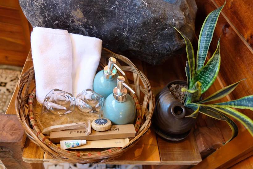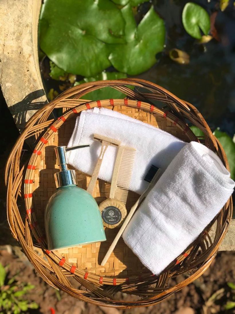 Không chỉ vậy nơi này sử dụng các vật dụng cá nhân thân thiện với môi trường như bàn chải đánh răng tre, lược, thân dao cạo từ bột ngô, ống hút từ bột gạo, xà phòng organic. À ngay cả đến các hóa chất như dầu gội, sữa tắm, sữa rửa bát cũng chứa trong lọ, chai sứ.