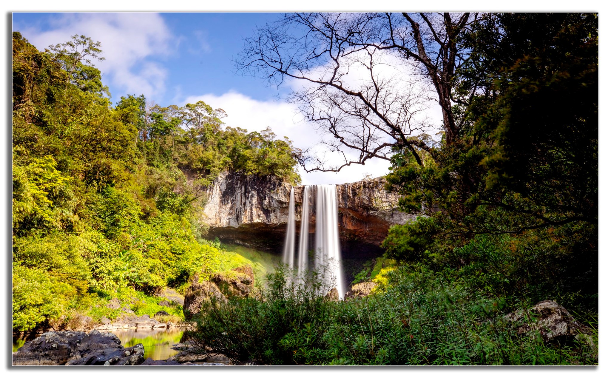 1 dài nước dài cả chục mét đang đổ dài ầm ầm, trắng xóa dội vào vách đá