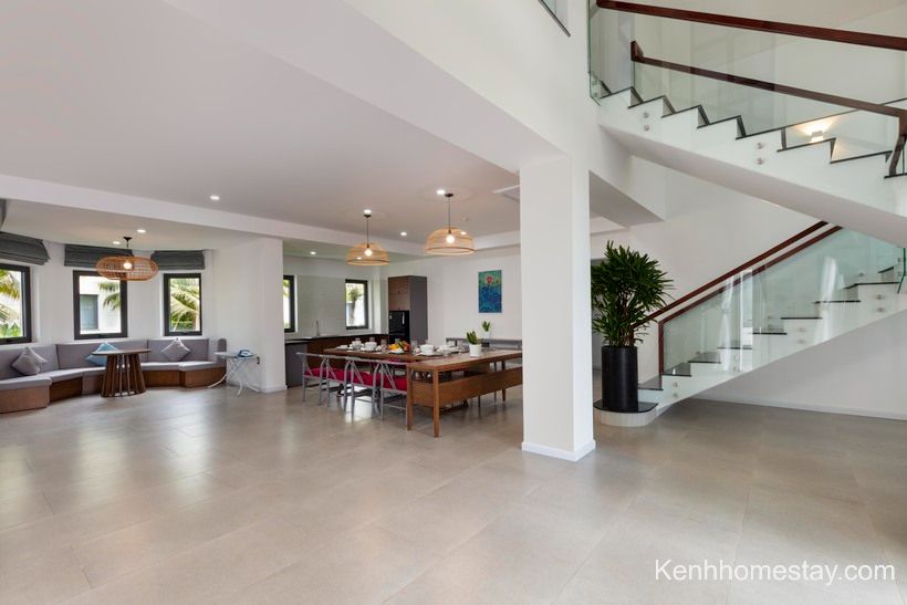 Bên trong căn vô cùng rộng rãi và đa số là không gian mở, nên ánh sáng luôn ngập tràn. Nhờ đó tạo cảm giác rộng rãi thoải mái cho khách hàng, phù hợp để tổ chức các hoạt động tụ tập. Bên ngoài căn có sân cỏ và bể bơi và đầy đủ tiện ích khác nhau để có thể giải quyết mọi nhu cầu của khách hàng.