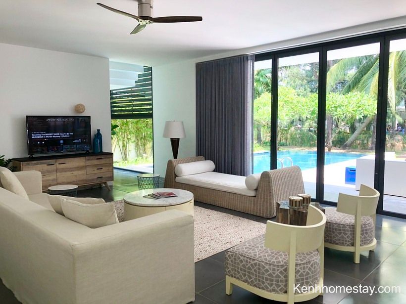 Bên trong villa Hồ Tràm là phòng sinh hoạt chung rộng rãi với bộ sofa êm ái, TV màn hình phẳng cùng gian bếp đầy đủ tiện nghi và hệ thống wifi bao phủ khắp villa. Cùng với đó là 5 phòng ngủ với không gian thoáng rộng, ban công có tầm nhìn tuyệt đẹp hướng ra biển. Đồ decor cũng được trang trí hết sức tinh tế, bathroom đồng bộ với hệ thống vòi sen riêng biệt theo tiêu chuẩn quốc tế.