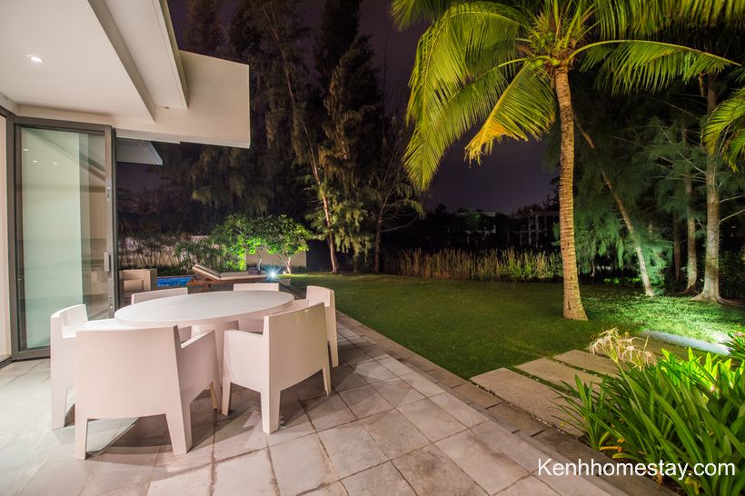 Ở không gian bên ngoài căn villa Hồ Tràm này có sân vườn cũng như hồ bơi, là không gian sinh hoạt chung. Đây là nơi phù hợp để tổ chức những buổi ăn uống, hát hò, vui chơi cho thực khách. Bạn có thể tổ chức một bữa BBQ nhỏ hoặc những buổi party ở đây mà vẫn đảm bảo được sự riêng tư.